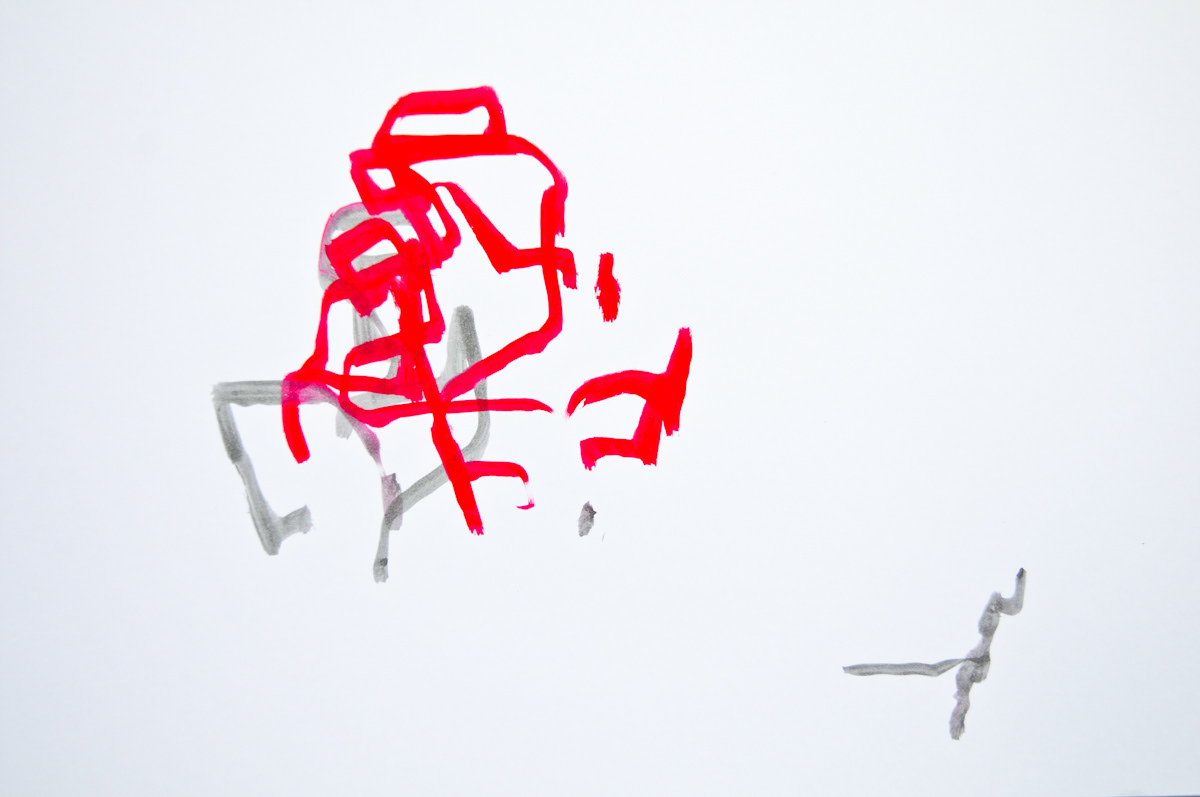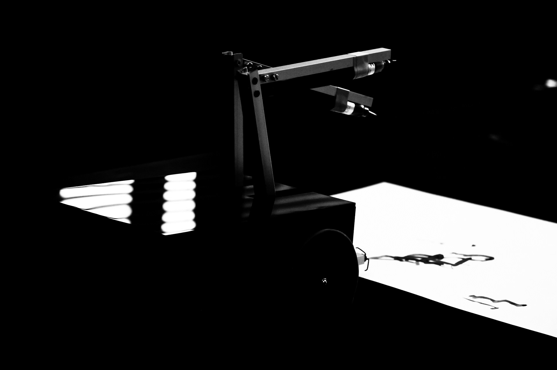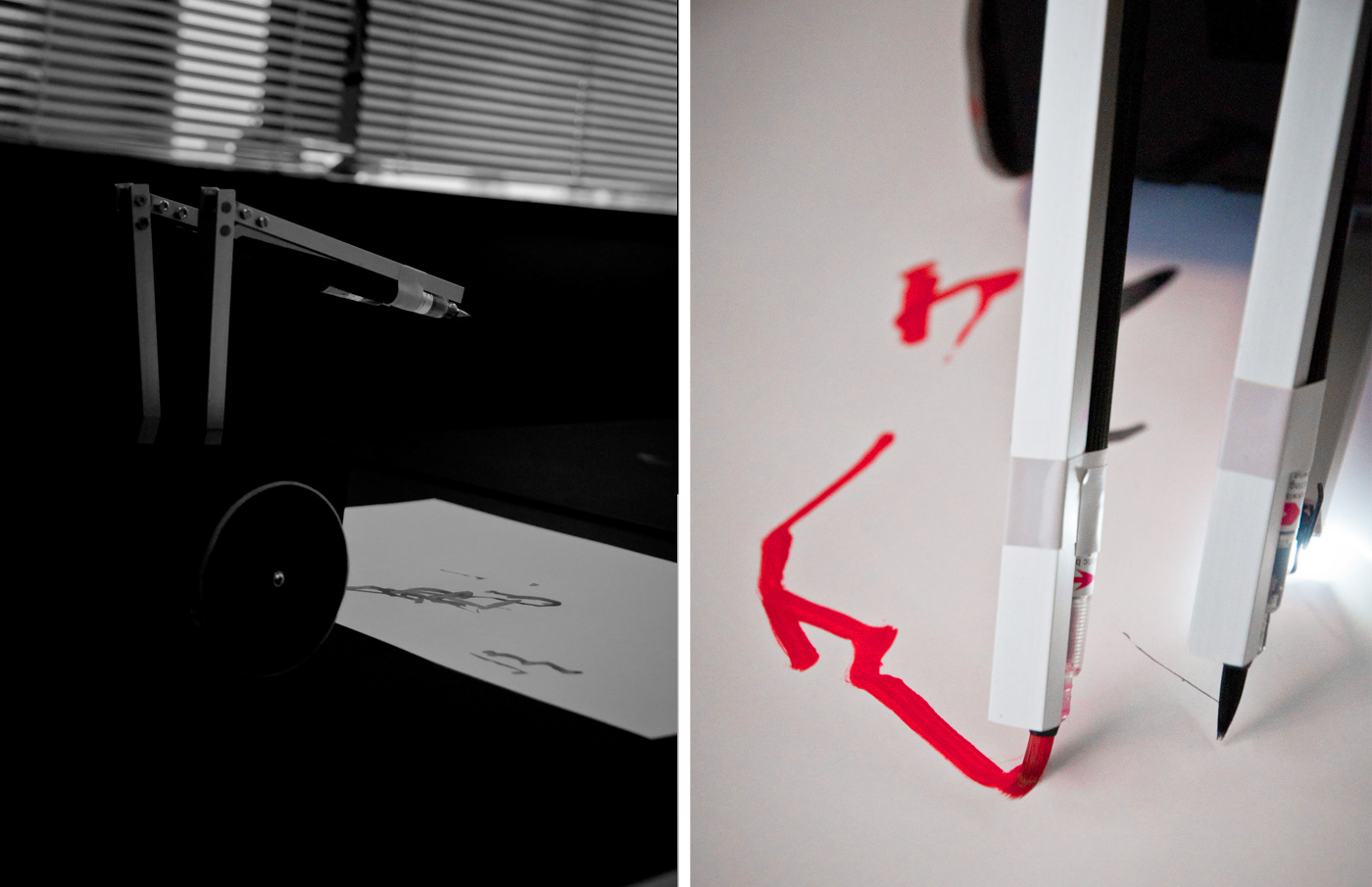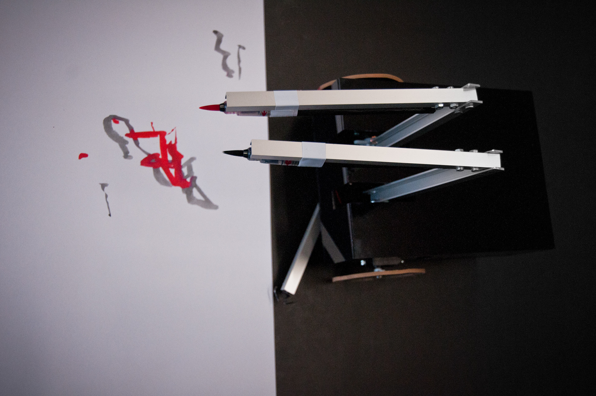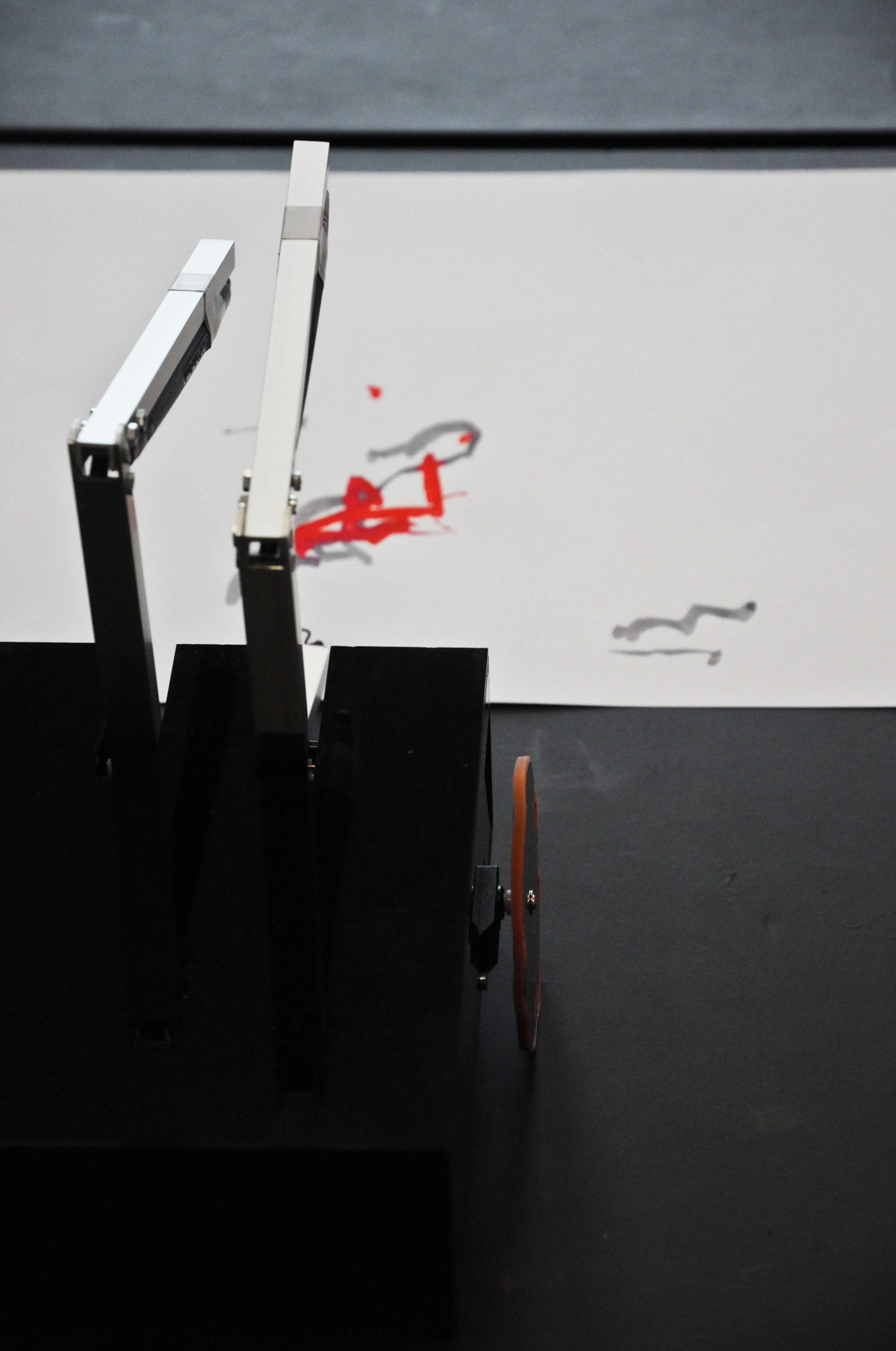 BNJMN is a mobile sensory image production mechanism. A modular acrylic body with three wheels and two autonomous arms. His two color paintings are a documentation of his distinct coded behavioral attributes. He is programmed with a set of parameters to determine a visual recordablle outcome, but every painting BNJMN creates is a unique representation of a brief moment of robotic psychosis. That moment begins after he has found and calculated a suitable canvas (paper) and is complete once he leaves his signature.