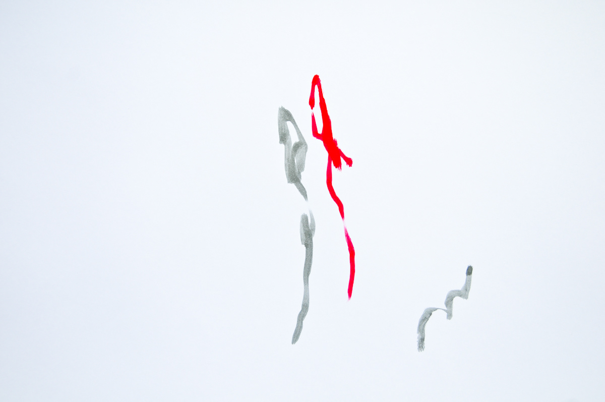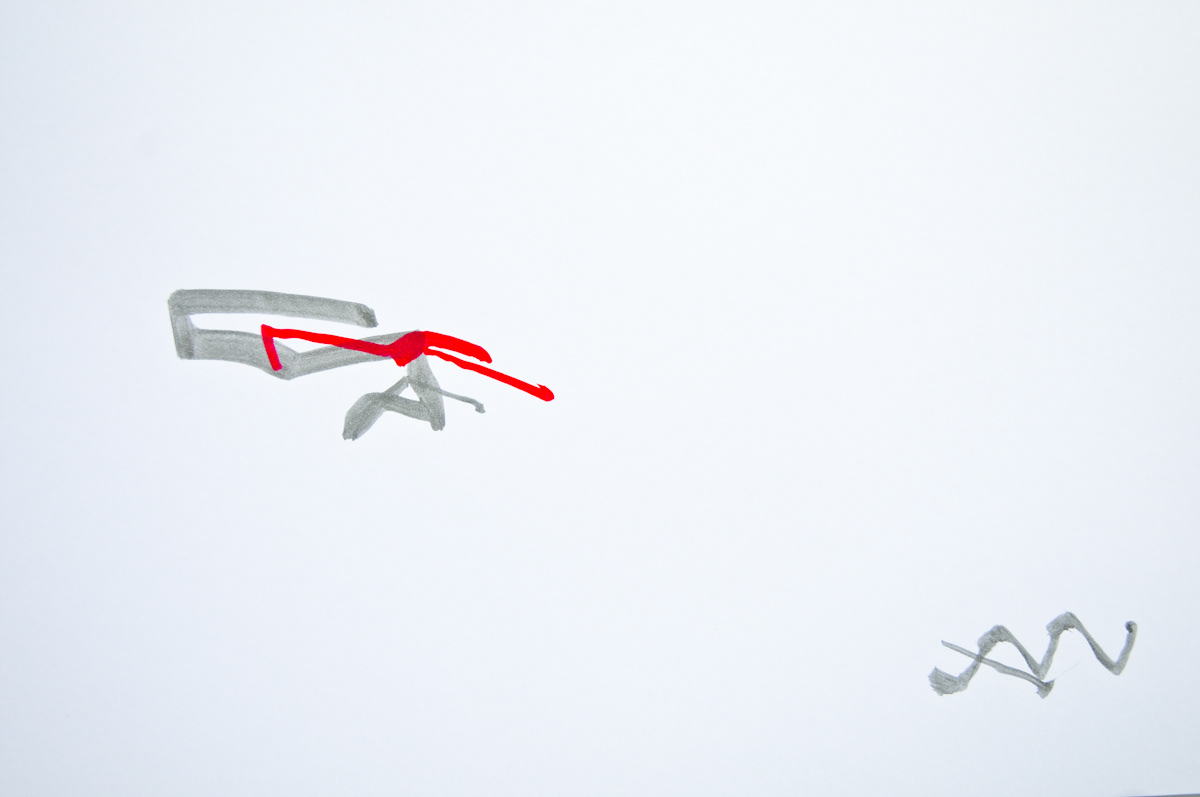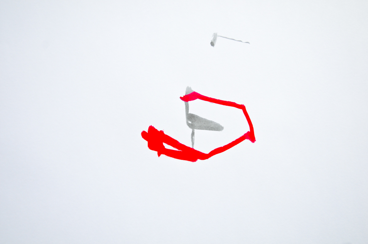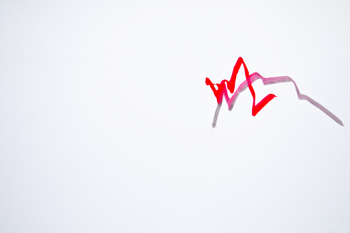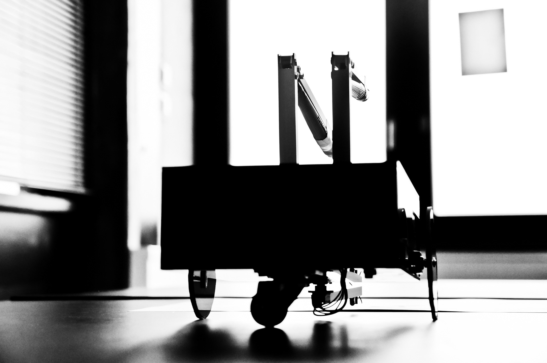 BNJMN is a mobile sensory image production mechanism. A modular acrylic body with three wheels and two autonomous arms. His two color paintings are a documentation of his distinct coded behavioral attributes. He is programmed with a set of parameters to determine a visual recordablle outcome, but every painting BNJMN creates is a unique representation of a brief moment of robotic psychosis. That moment begins after he has found and calculated a suitable canvas (paper) and is complete once he leaves his signature.